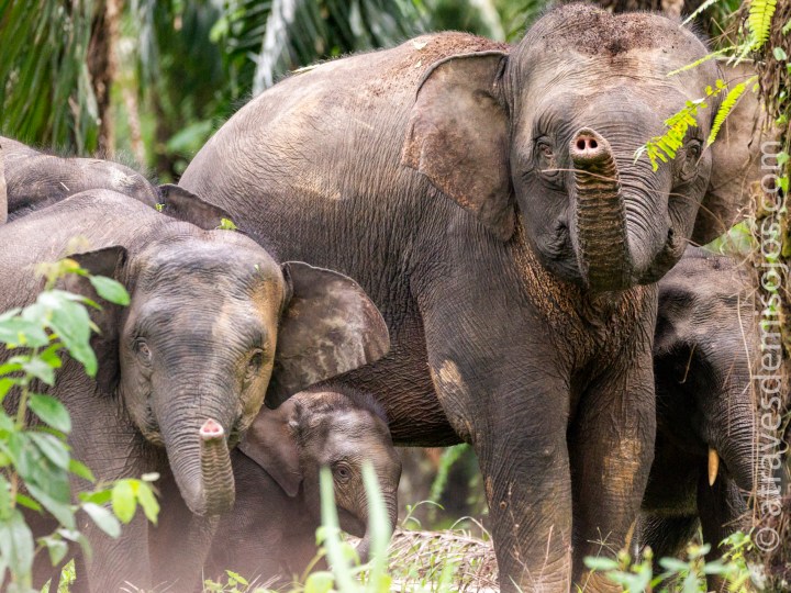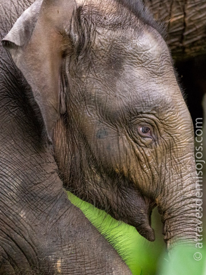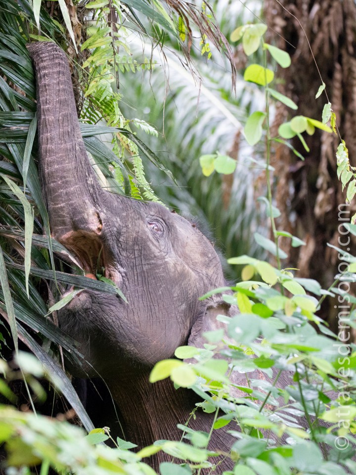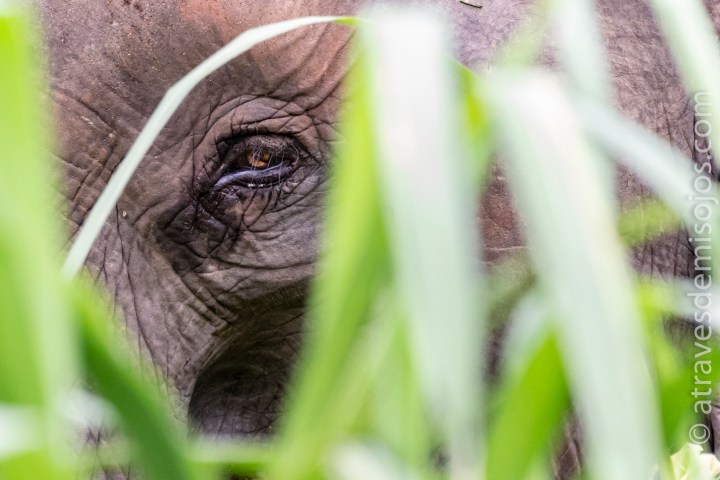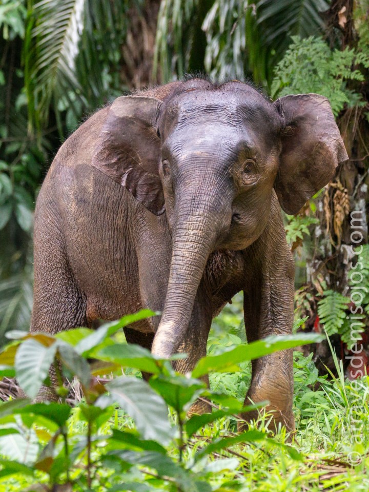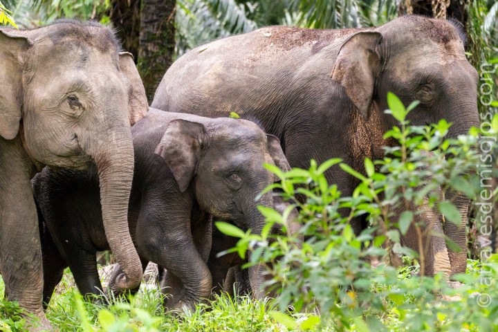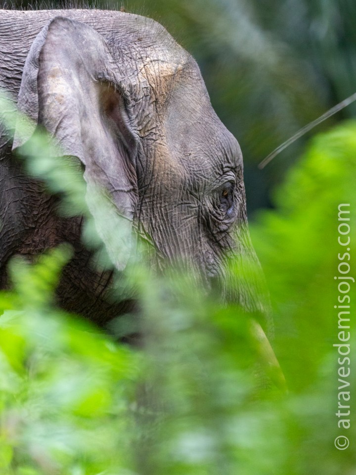 Entre las plantaciones de la palmera no hay alimento ni modo de vida posible, excepto para los elefantes. Estos sí se alimentan de la hoja de la palmera. No obstante es muy triste ver a este animal tan excepcional entre filas y filas de palmeras y no entre la biodiversidad de una selva virgen. Sinceramente, de saberlo hubiéramos ido a a Danum Valley en lugar de visitar el río Kinabatangan. A pesar de todo pude captar estas imágenes de tan bello animal, el elefante pigmeo de Borneo, subespecie del elefante pigmeo y endémica de la isla.
